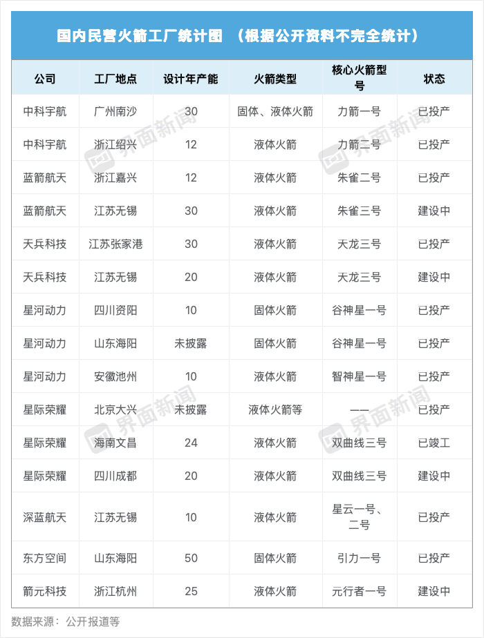 据界面新闻不完全统计,目前国内头部民营火箭企业已至少建有15个工厂,火箭设计年产能超280发。